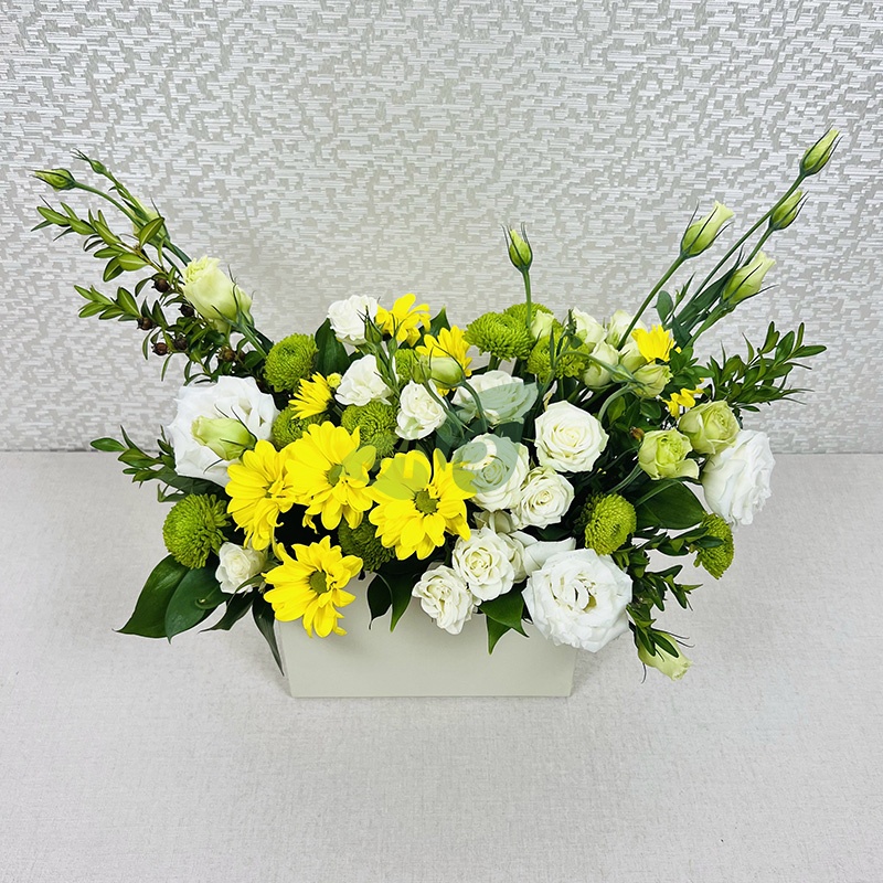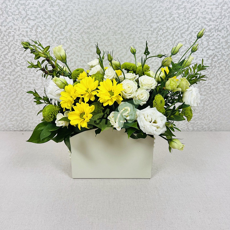 Облако кустовых роз и желтые хризантемы в коробке – такую прелесть можно заказать с доставкой в любой район Абакана.
